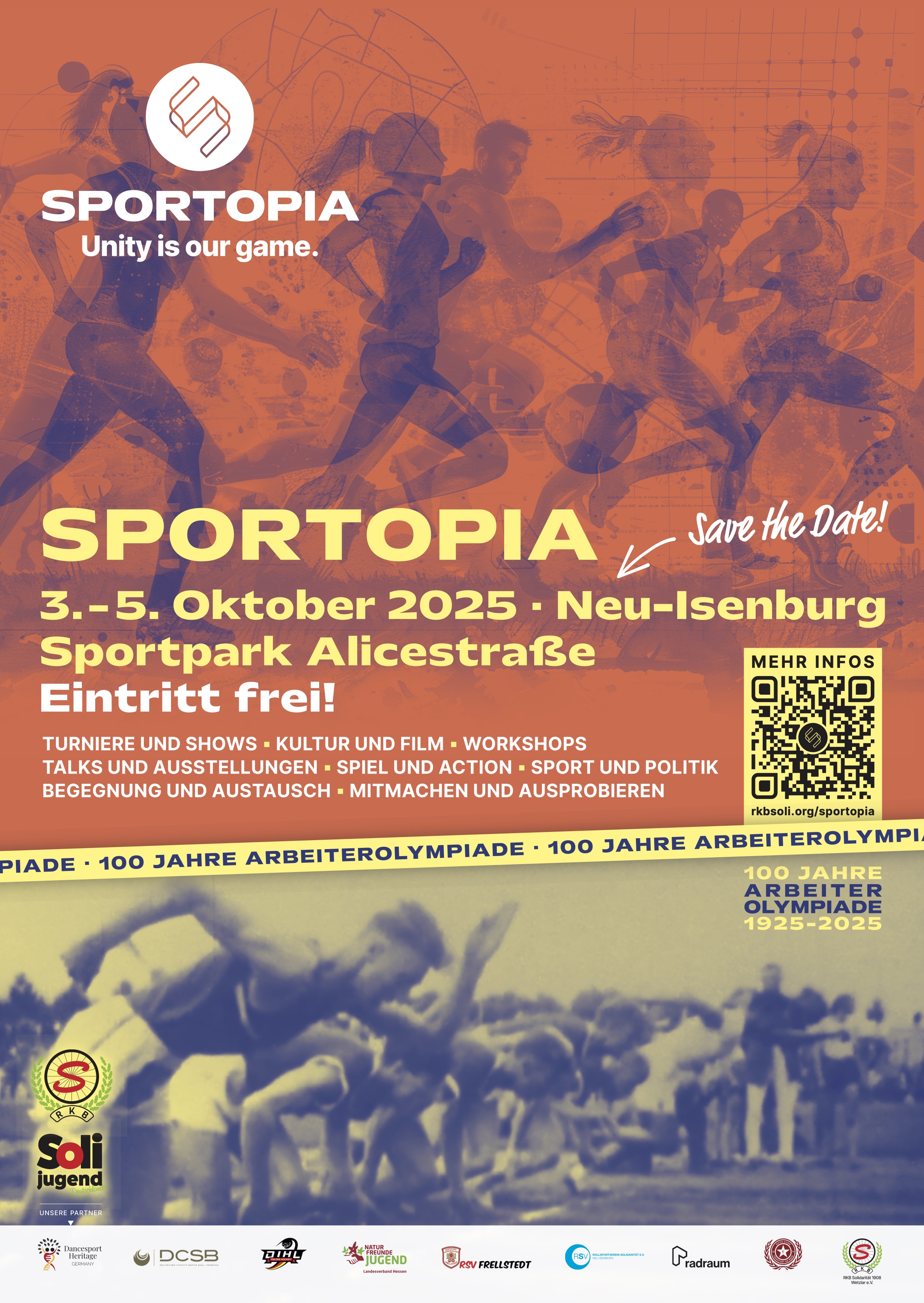 „Bei uns geht es nicht allein um die sportliche Leistung“, sagt Tobias Köck, einer der ehrenamtlichen Organisatoren des RKB. Mindestens ebenso wichtig wie Wettkampfergebnisse seien der Austausch unter den Sportler*innen und die Völkerverständigung. Um an die Arbeiterolympiade vor 100 Jahren zu erinnern und deren Gedanken weiterzutragen, veranstaltet der RKB Solidarität gemeinsam mit seinem Jugendverband, der „Solijugend“, und weiteren Kooperationspartnern am ersten Oktober-Wochenende deshalb ein eigenes Turnier: „Sportopia“.