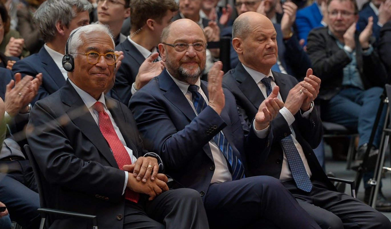 EU-Ratspräsident António Costa, der FES-Vorsitzende Martin Schulz und Bundeskanzler Olaf Scholz