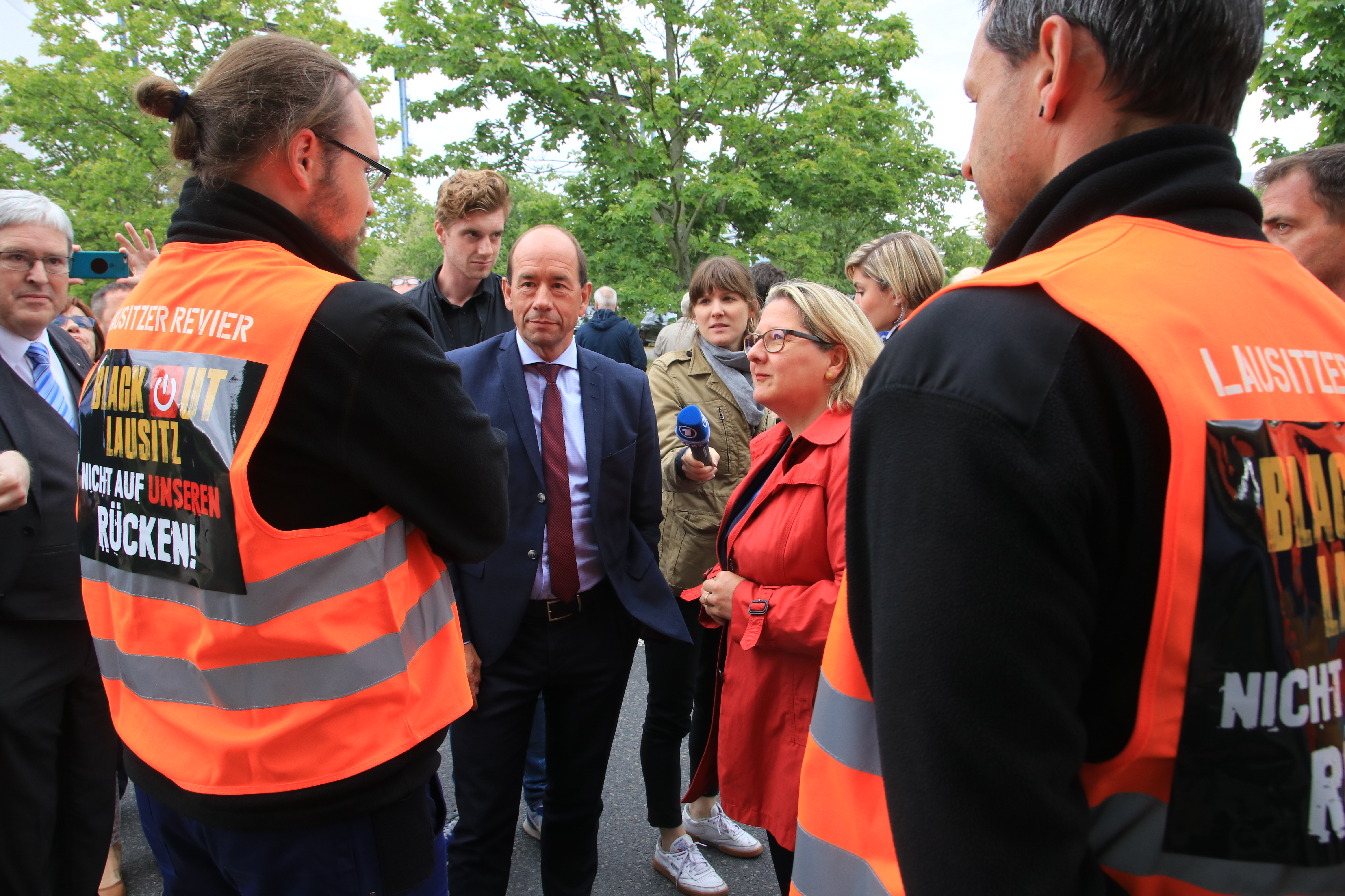 Betrieben wird die Schwarze Pumpe von der Lausitzer Energie Kraftwerke AG (Leag). Deren Gesamtbetriebsratsvorsitzender Uwe Teubner erklärt Schulze vor dem Werkstor per Megaphon: „Die Energiewirtschaft braucht keine CO2-Steuer!“ Er fordert von der Ministerin Planungssicherheit und eine Perspektive für die Mitarbeiter, die Beschlüsse der Kohlekommission soll sich schnellstmöglich in Gesetzen wiederfinden. „Wir sind uns einig“, spricht er Schulze direkt an, „Ich hoffe, das sind wir immer noch.“ Die Ministerin müsse jetzt für Klarheit sorgen.