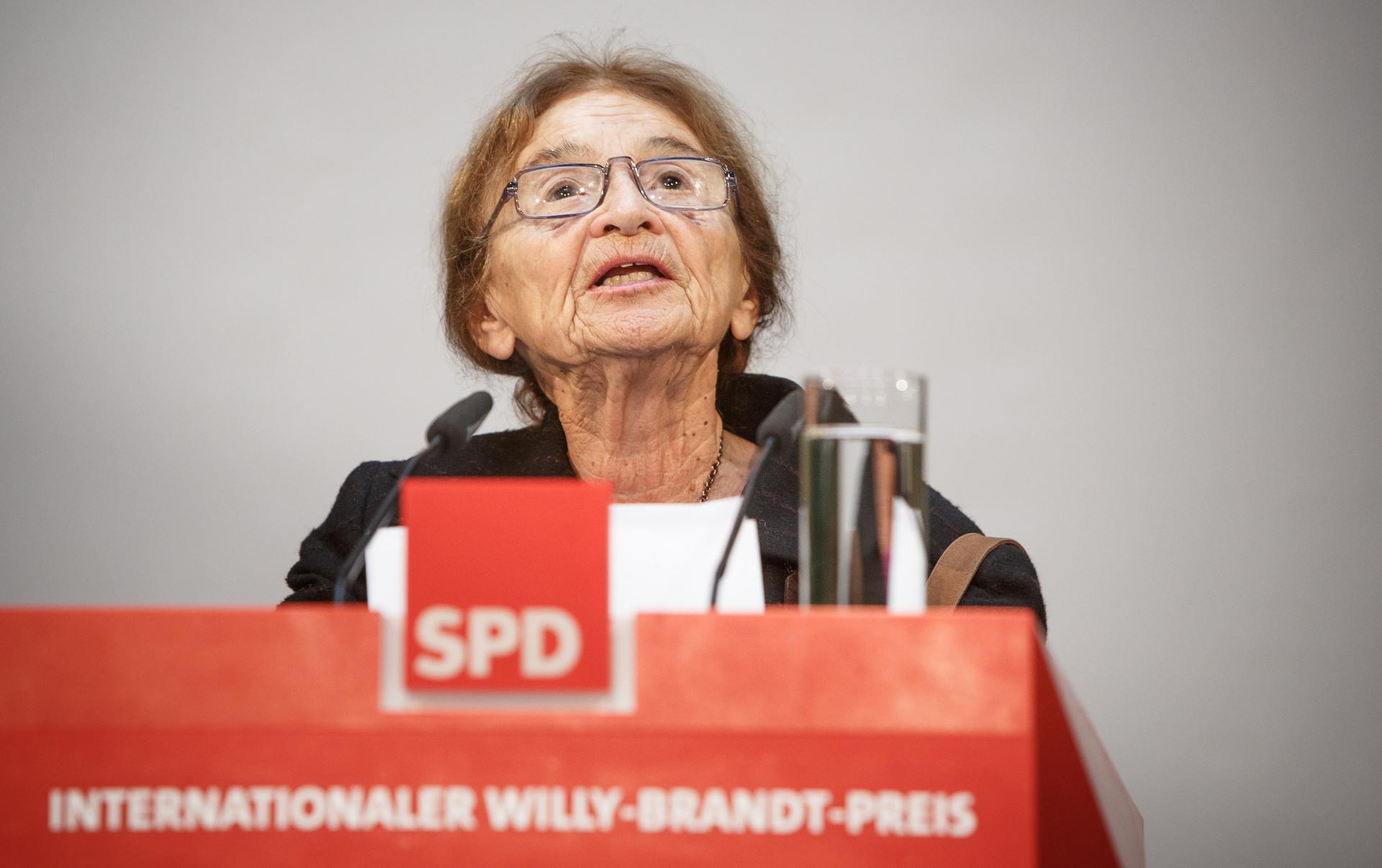 Àgnes Heller ist eine kleine Frau. Sie ragt kaum über das Rednerpult hinaus, neben ihr steht die große Statue von Willy Brandt. In der Philosophie jedoch ist Heller eine Riesin – und zwar eine, die ihre Position nutzt, um auf politische und gesellschaftliche Missstände hinzuweisen. In ihrer Heimat Ungarn, wo Heller nach vielen Jahren im Ausland wieder wohnt, hat sie sich mit dem repressiven Regime von Viktor Orbán angelegt. Für diesen Einsatz gegen Totalitarismus und für Freiheit wurde Àgnes Heller nun in Berlin mit dem Internationalen Willy-Brandt-Preis ausgezeichnet. Die britische Journalistin und WikiLeaks-Mitarbeiterin Sarah Harrison erhielt den Preis für besonderen politischen Mut.